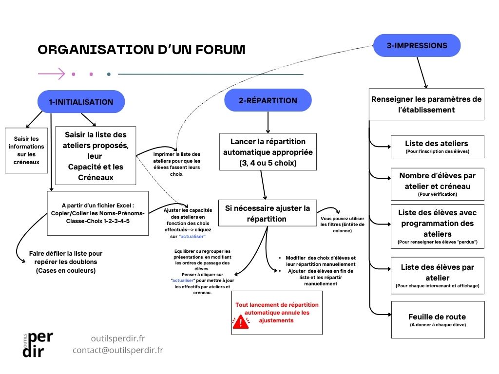 • de générer tous les documents nécessaires : listes par atelier et créneau (pour les intervenants), feuilles de route individuelles (pour les élèves)…..